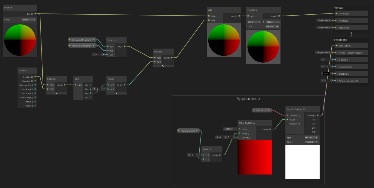 Now that we have our formula, our new values, we can create an add node, add in those values, and plug back in the position of the object. So that as the position of the camera and player changes, the shader is updating the position of the mesh.