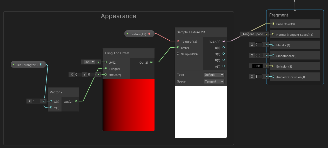 Therefore I'm going to add a vector 2 node here, but control it with a single value plugging in a float value here, and then turning it into a property so that I can control it from the inspector. Also, make sure that value on the vector 2 is 1 instead of 0 or else you won't get any tiling. I'm only plugging the float into the Y slot because I only want to tile one way. If you want to tile both ways, you can plug the float value into the X and the Y slot.