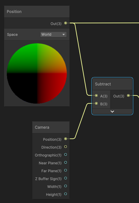 We are then going to subtract the camera position from the world position of the object using the subtract node.