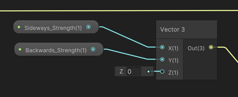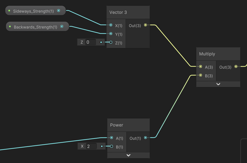Well, in that case, we need to add a vector 3 node. Since I want to be able to control these values from the inspector, I'm going to create 2 float nodes and turn them into properties. One is going to be Sideways Strength, and the other is going to be Backwards Strength. And we'll plug Sideways strength into the X slot, and the Backwards strength into the Y slot. And we're going to leave the Z value at 0 here so that it is unchanged. X to the power of 0 is still 0, so there's no reason to use a Vector 2 instead of a Vector 3 and have to do weird math gymnastics.