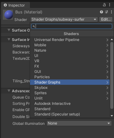 Now, let's switch back to the editor and apply this to an object. To apply a shader to an object, we first have to create a new material. To add a shader to this material, I need to find the shader dropdown. The default is the universal render pipeline, but if I click into the dropdown, I can see a section for Shader Graph shaders, which the shader we just created is under. With that done, I can drag and drop my new material onto my objects.